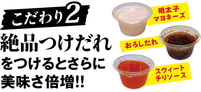 明太子マヨネーズ・おろしだれ・スウィートチリソースの3種類をご用意しています。(別売りで120円です)