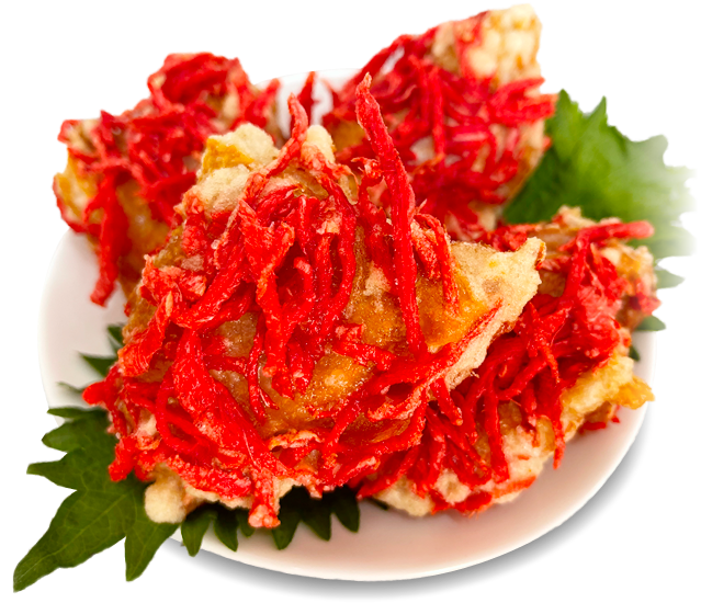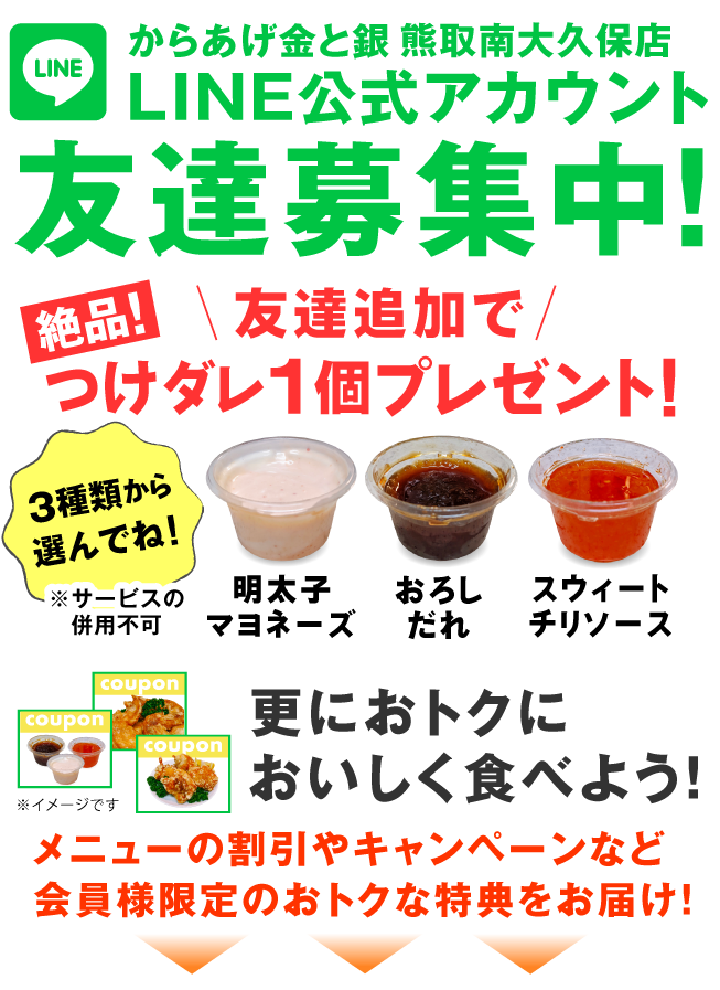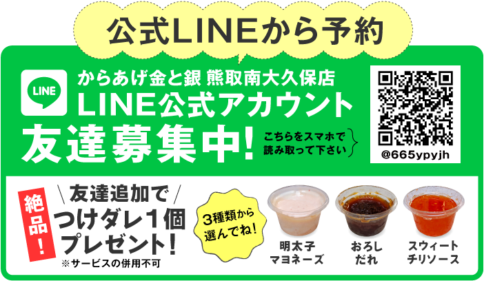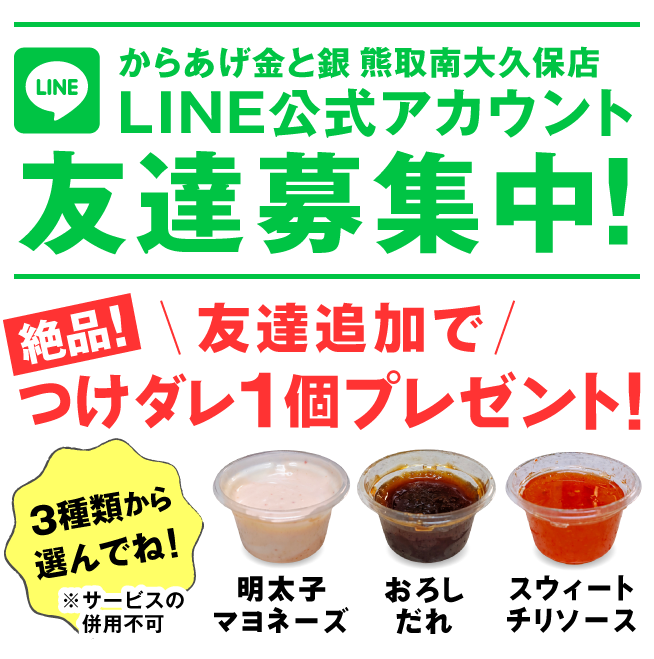 明太子マヨネーズ・おろしだれ・スウィートチリソースの3種類をご用意しています。(別売りで120円です)